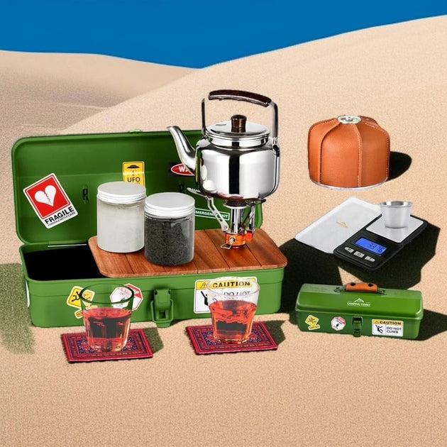 صندوق طقم عزبة الشاي المتكامل للرحلات والبر