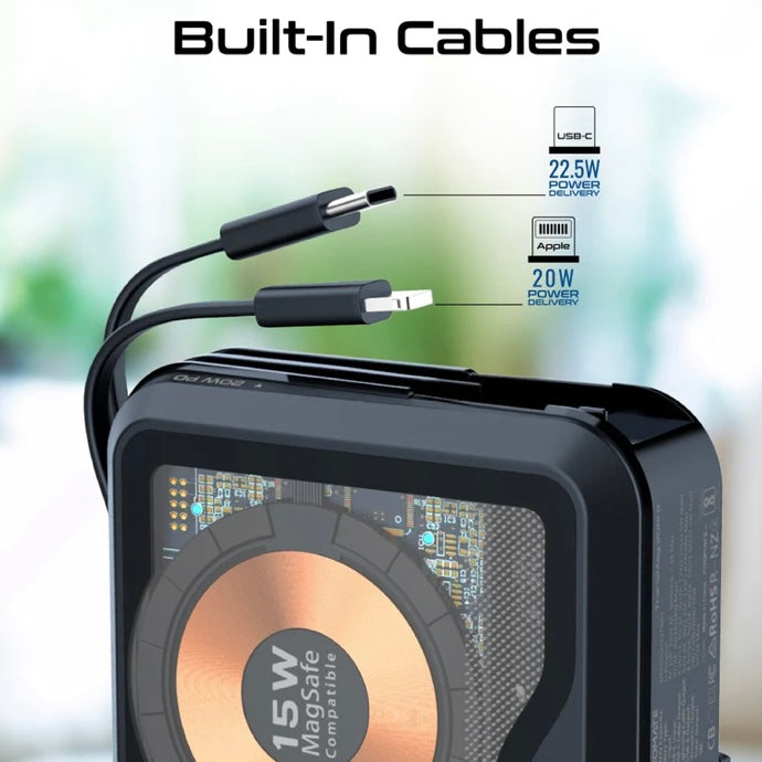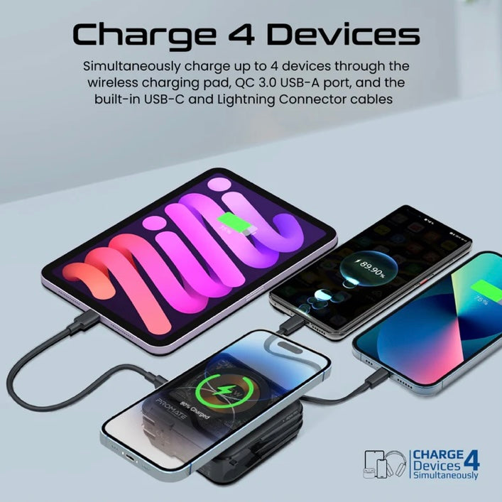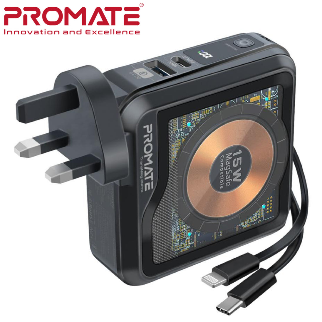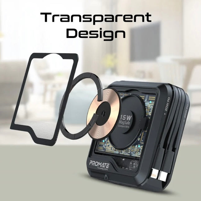بنك الطاقة اللاسلكي TransMag-20Pro من PROMATE هو تجسيد مثالي للتكنولوجيا المتقدمة والتصميم الأنيق. يجمع هذا الجهاز الثوري بين الشحن اللاسلكي السريع المتوافق مع MagSafe بقوة 15W والتصميم الشفاف الفريد، مما يوفر تجربة شحن غير مسبوقة أثناء التنقل. تضمن الكابلات المدمجة من USB-C و Lightning عدم الحاجة لحمل كابلات إضافية، بينما توفر المدخلات الكهربائية AC شحناً سريعاً للبنك الطاقة وتحوله إلى شاحن جداري.