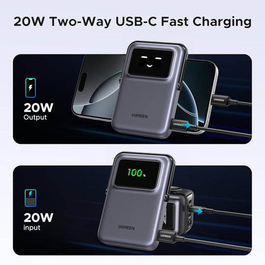 باور بنك بسعة 20000 مل أمبير وقوة 30 وات مع كابل شحن Type-C مدمج من UGREEN