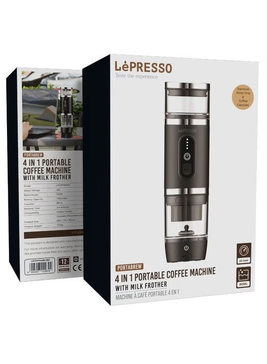 ماكينة قهوة محمولة 4 في 1 مع خفاق حليب، متوافقة مع كبسولات نسبريسو ودولسي جوستو وبودرة القهوة من Lepresso