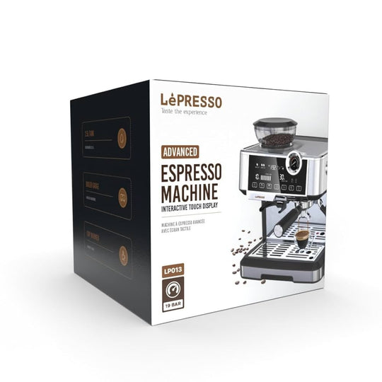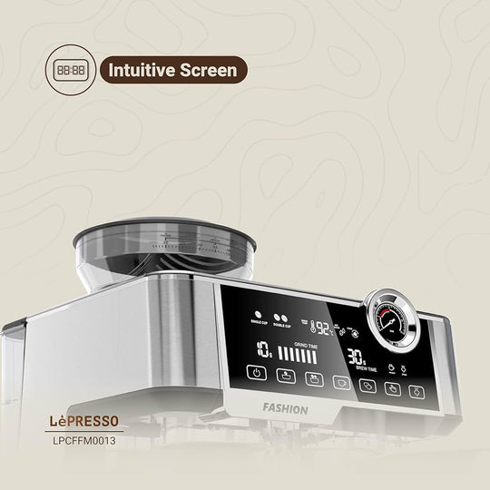 ماكينة تحضير القهوة مع مطحنة قهوة، اعداد طحن قابل للتعديل بقوة 19 بار وسعة 2.5 لتر، مقياس تسخين الاكواب، وشاشه تفاعليه من Lepresso