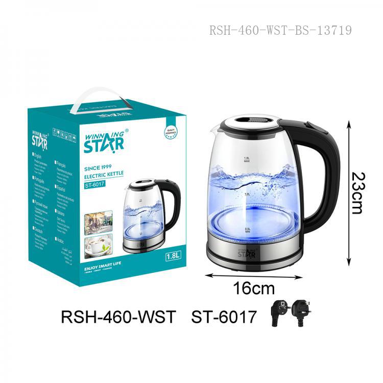 غلاية كهربائية عالية الأداء من WINNING STAR، تعمل بجهد 220-240 فولت وبقوة 1500 واط. مصنوعة من ستانلس ستيل SS201 وزجاج بوروسيليكات عالي الجودة، مما يضمن المتانة والمظهر الأنيق. تحتوي على قاعدة تسخين بسمك 0.4 سم ونظام حماية تلقائي ضد الغليان والجفاف.