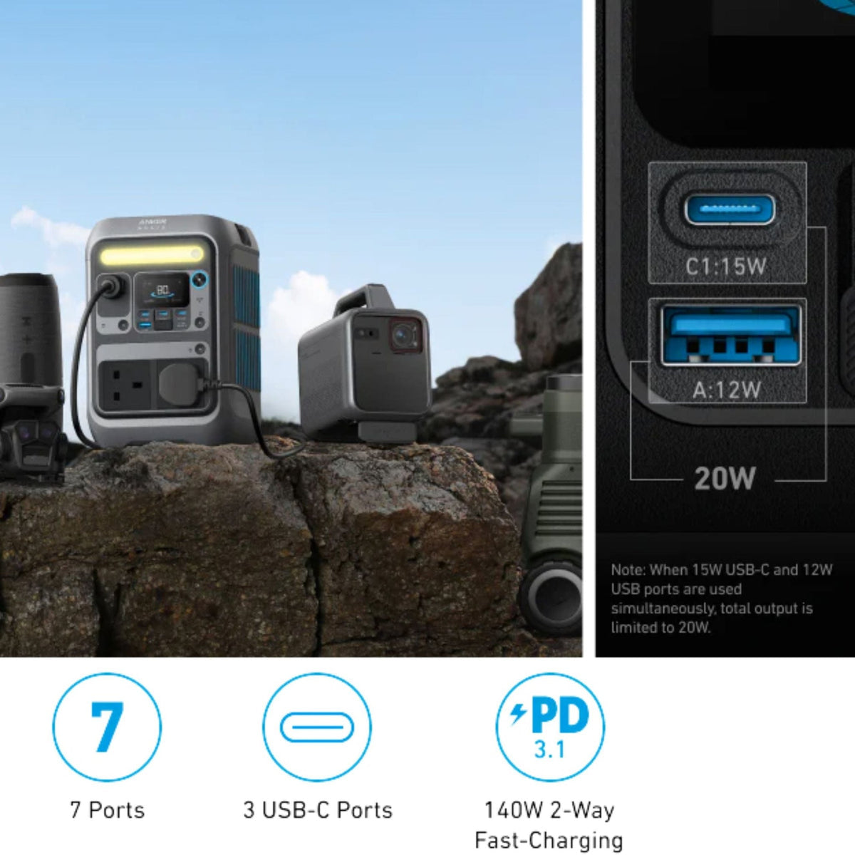 محطة الطاقة المحمولة أنكر سولكس C300 تأتي بسعة 288 واط ساعة وقدرة إخراج تصل إلى 300 واط. صُممت لتلبية احتياجاتك من الطاقة أثناء السفر أو التخييم أو في حالات الطوارئ. تحتوي على منافذ متعددة لشحن الأجهزة الإلكترونية مثل الهواتف المحمولة، الأجهزة اللوحية، وأجهزة الكمبيوتر المحمولة، بالإضافة إلى منفذ تيار متردد لتشغيل الأجهزة الصغيرة. تتميز بتقنيات حماية لضمان الشحن الآمن والسريع، مما يجعلها خيارًا مثاليًا لتوفير الطاقة في أي مكان وأي وقت.
