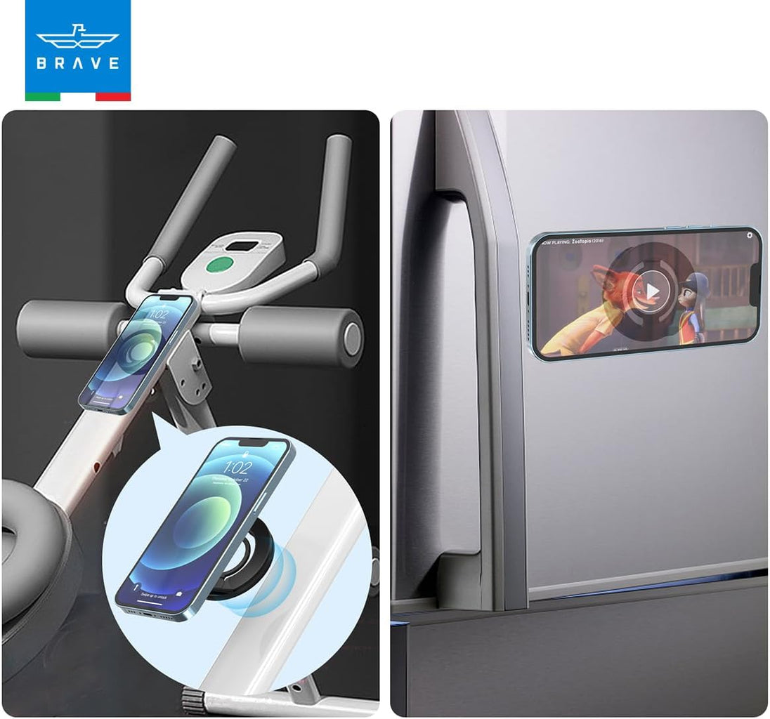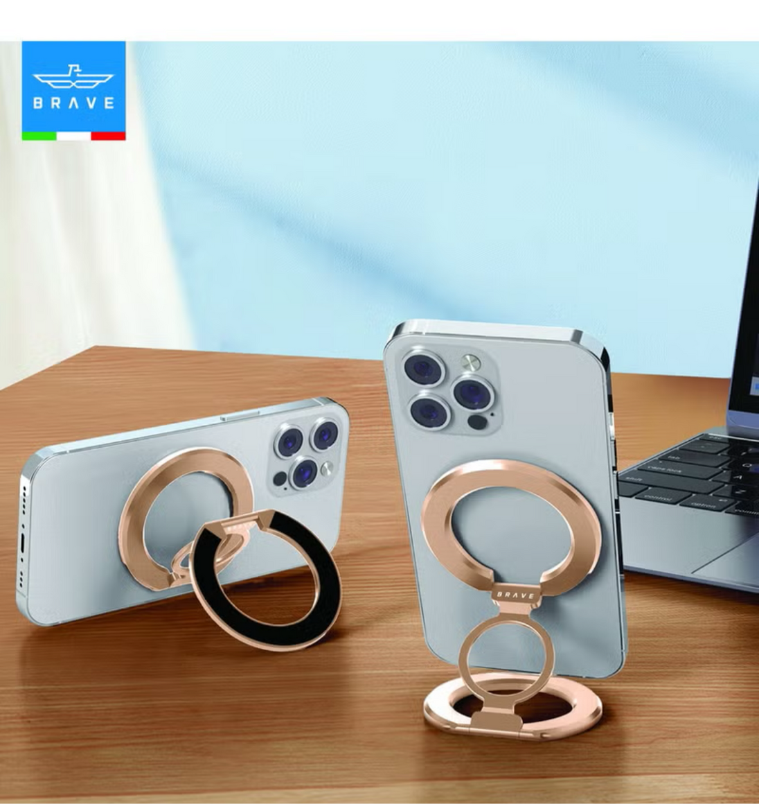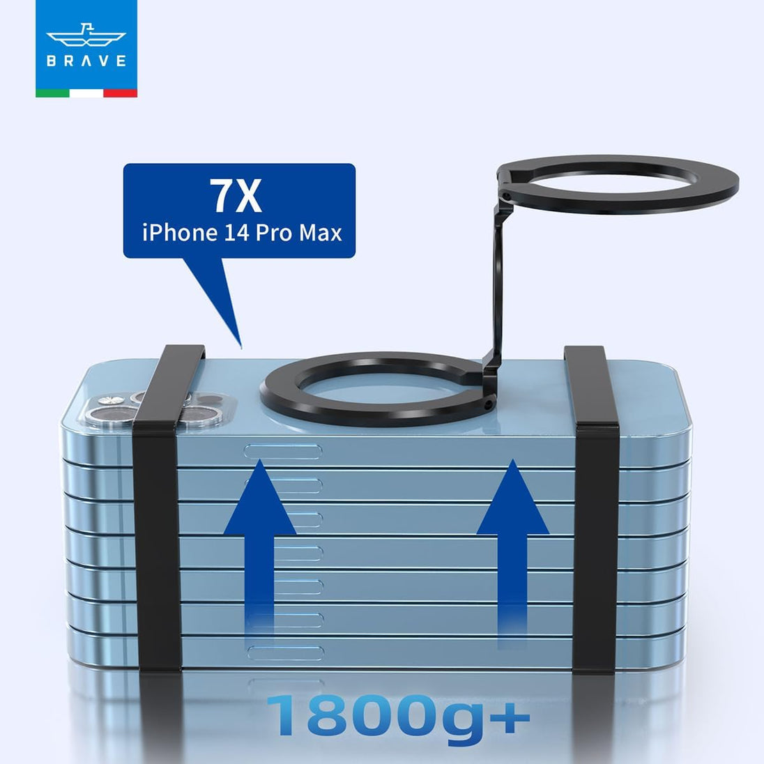 تم تصميم حامل الهاتف المغناطيسي BRAVE خصيصًا لهواتف iPhone من سلسلة 12 إلى 16 وأغطية MagSafe. كما أنه متوافق مع الهواتف غير المغناطيسية وأغطية الهاتف العادية عند استخدام الحلقة المعدنية الرفيعة (مرفقة) على ظهر الجهاز.