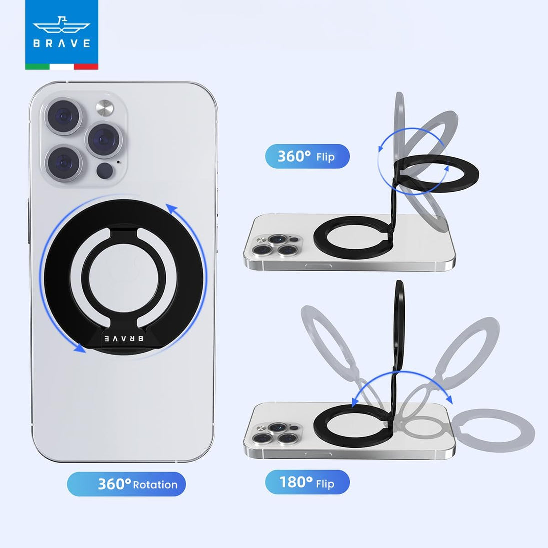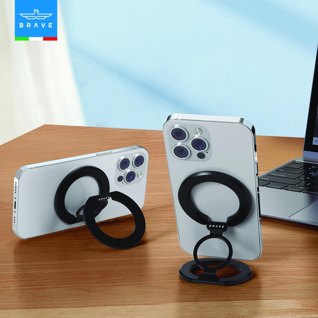 BRAVE حامل هاتف مغناطيسي 3 في 1 قابل للطي – حامل مغناطيسي عالمي لهواتف iPhone وSamsung وجميع أجهزة iOS وAndroid | حلقة مغناطيسية متوافقة مع MagSafe وتعمل كمسند مكتبي