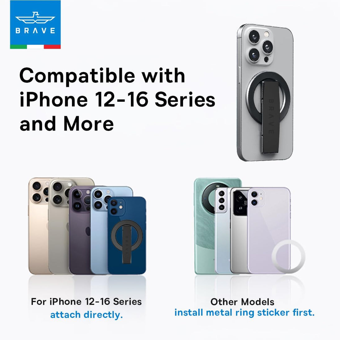 BRAVE حامل هاتف مغناطيسي 3 في 1 – قبضة إصبع، مسند، وقبضة MagSafe قابلة للإزالة – متوافق مع iPhone 11-16، Samsung S22-S24، وجميع أجهزة iOS وAndroid