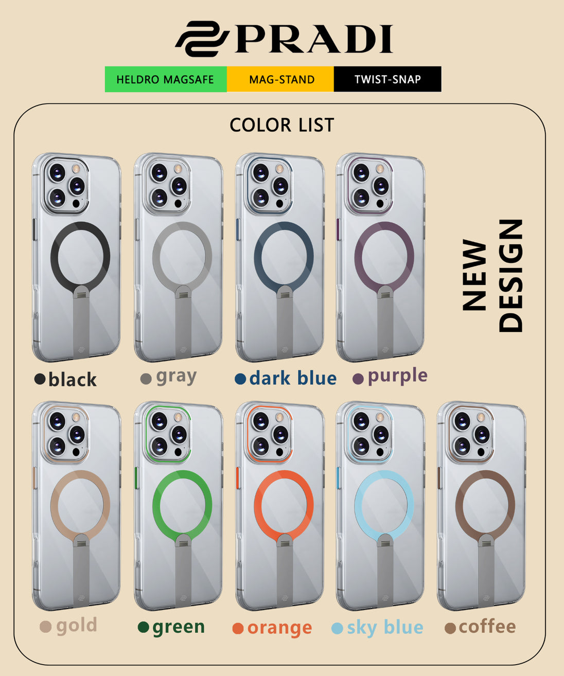 📱 غطاء PRADI – تصميم شفاف مع حامل مدمج ودعم MagSafe