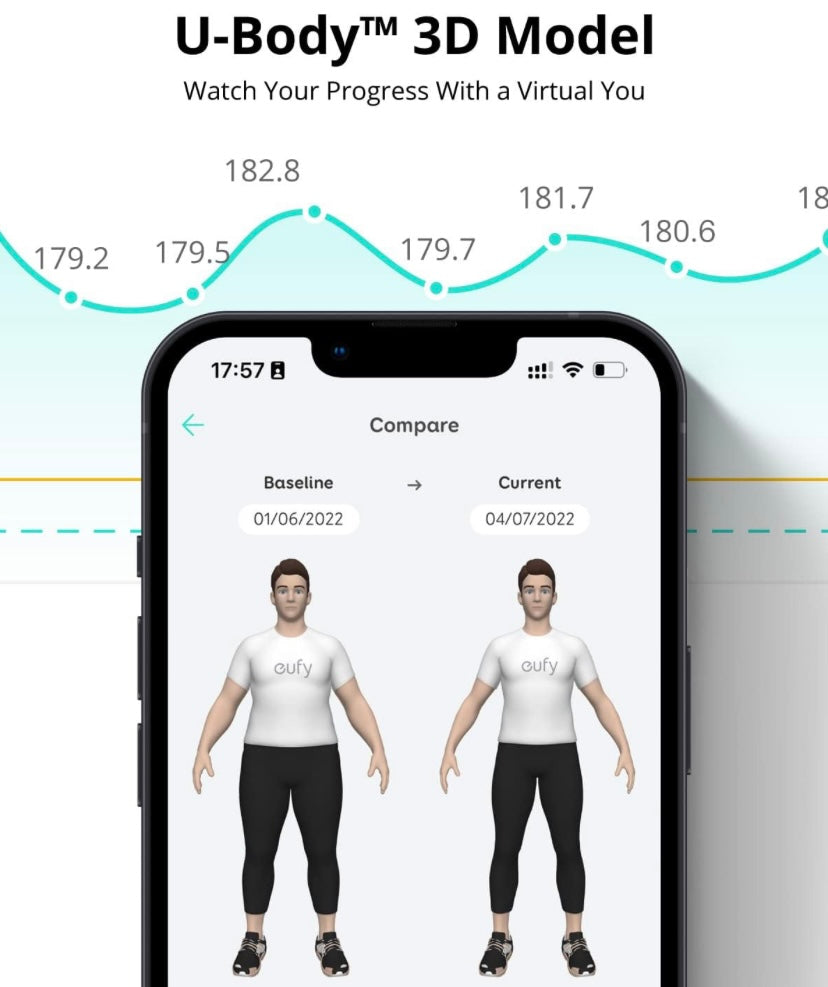 - **وضع الجسم الافتراضي ثلاثي الأبعاد:** يمكنك عرض جسمك ثلاثي الأبعاد على التطبيق ورؤية تطور تكوين جسمك مع مرور الوقت.
