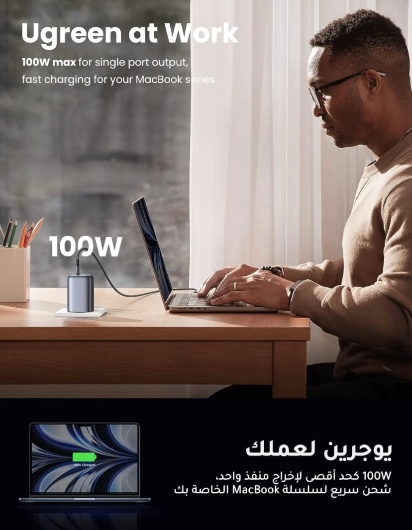 مع Ugreen Nexode 4-Port PD GaN Fast Charger 100W، يمكنك شحن أربعة أجهزة بسرعة وكفاءة عالية، مما يجعله خيارًا مثاليًا لأولئك الذين يحتاجون إلى العديد من الأجهزة متعددة الاستخدامات.