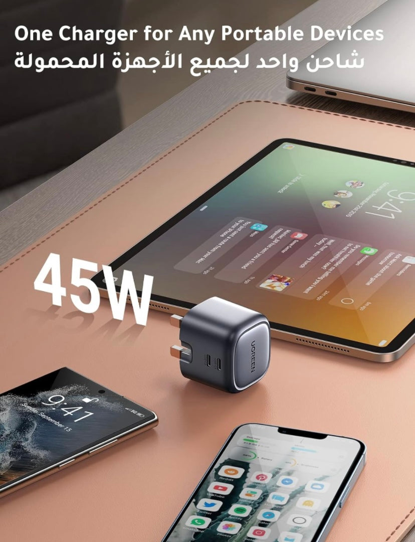 بفضل Ugreen Nexode Dual USB-C PD GaN Fast Charger 45W، يمكنك الاستفادة من شحن سريع لأجهزتك المحمولة بسهولة وفعالية أثناء التنقل.