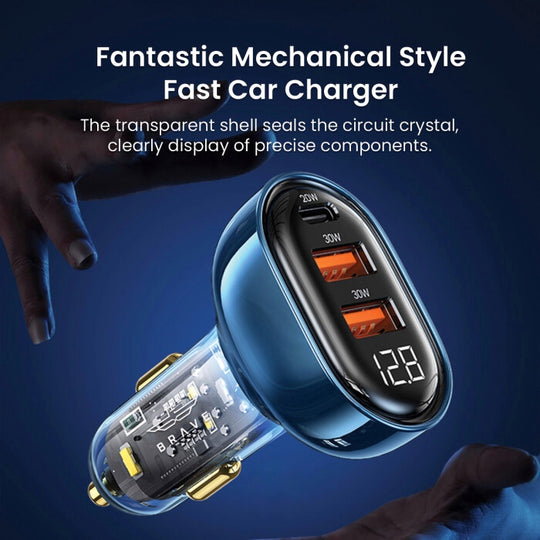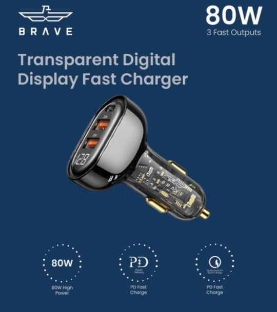شاحن سريع للسيارة بشاشة عرض رقمية شفافة و 3 منافذ بقوة 80 واط من BRAVE