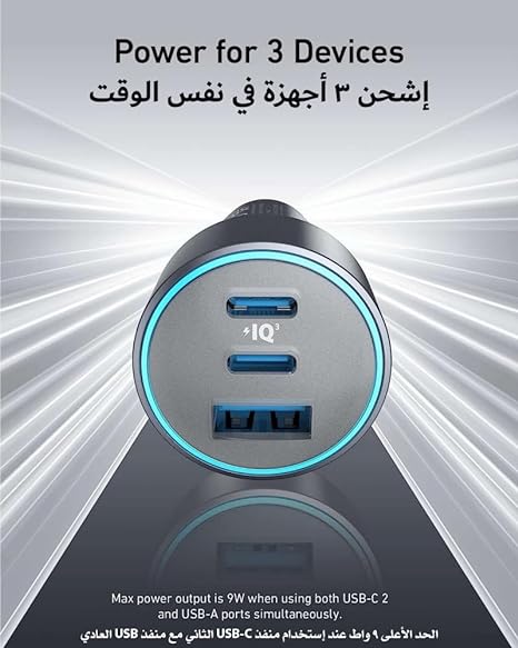 شاحن سيارة بمنفذ ثلاثي – 100 واط PD، USB-C وUSB-A سريع من Anker