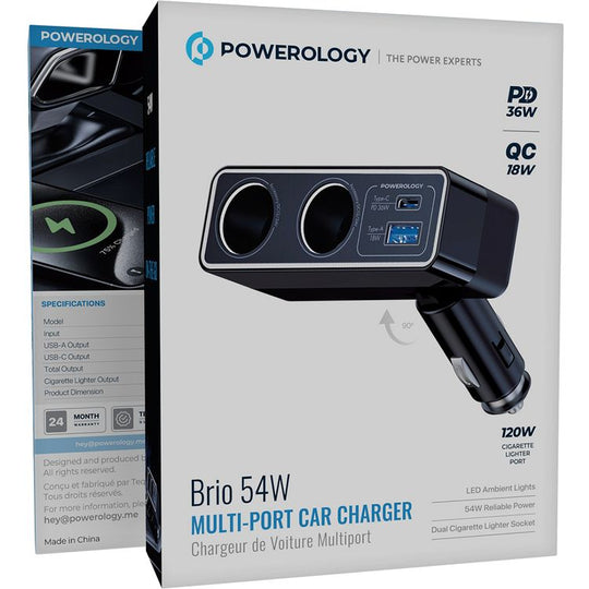 شاحن سيارة بريو متعدد المنافذ مع منفذ ولاعة مزدوج بقدرة 54 واط من Powerology