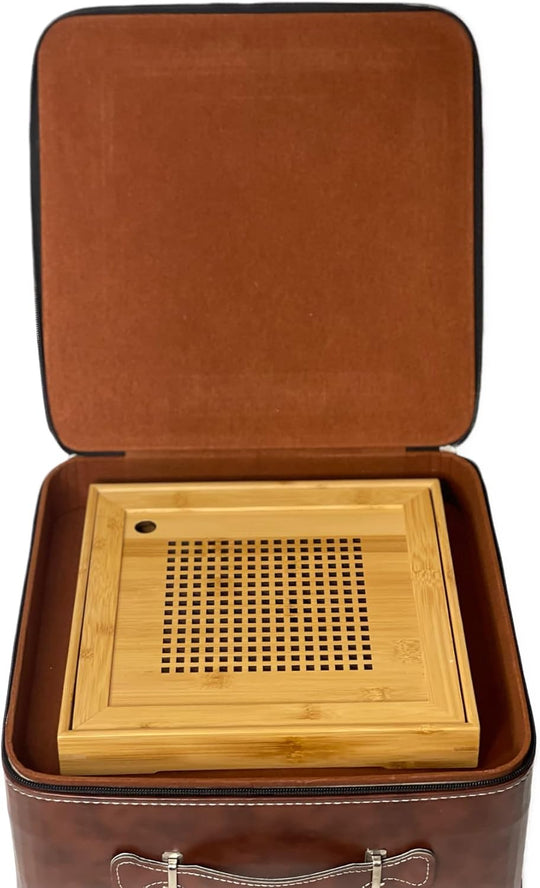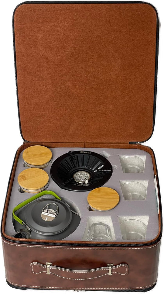 طقم شاي فاخر للرحلات - 7 قطع متكاملة مع إبريق فولاذي، أكواب، موقد غاز محمول، وصينية خشبية
