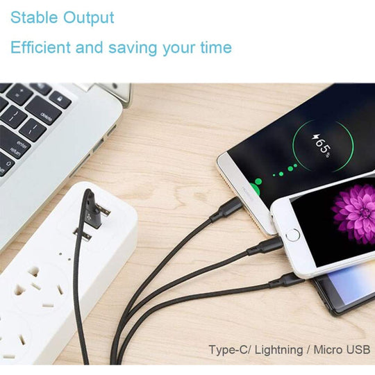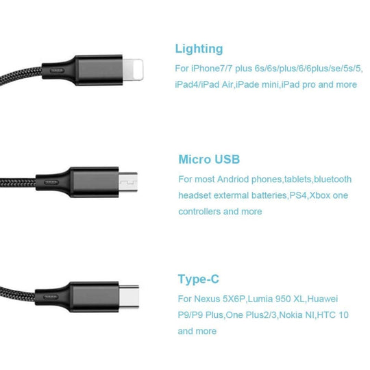 [واحد للجميع] كابل شحن 3 في 1 يشحن أيًا من أجهزتك باستخدام موصلات مايكرو يو اس بي المدمجة القابلة للتبديل ويو اس بي نوع سي (النوع سي) واللايتنينج. [متانة معززة] تعزيز فائق يحافظ على الأسلاك الداخلية...Regular price AED 65.00