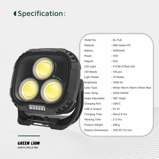 No reviewsاحصل على إضاءة قوية وعملية مع كشاف جرين ليون هايبر لوم المصمم لتلبية جميع احتياجاتك سواء في العمل، التخييم، المشاريع المنزلية، أو حالات انقطاع الكهرباء. بفضل 3 لمبات COB LED و 6 لمبات LED حمراء، يوفر...Sale price AED 75.00Regular price AED 110.00