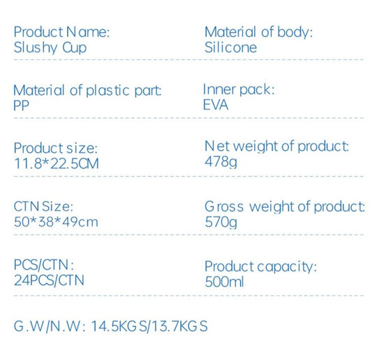 Product Name: Slushy Cup Product capacity: 500ml Material of plastic part: PP Product size: 11.8*22.5CM CTN Size: 50*38*49cm PCS/CTN: 24PCS/CTN Material of body: Silicone Inner pack:EVA Net weight of product: 478g Gross weight of product: 570g...Regular price AED 40.00 -