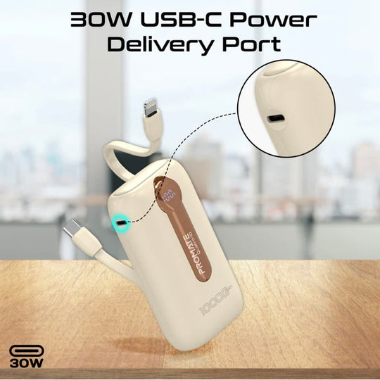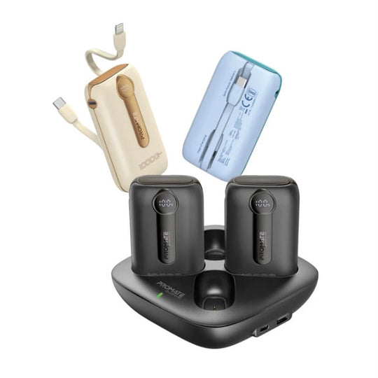 مجموعة الشحن المكونة من 4 قطع بقدرة 10000 مللي أمبير في الساعة من PROMATE مع كابلات USB-C و Lightning المدمجة.