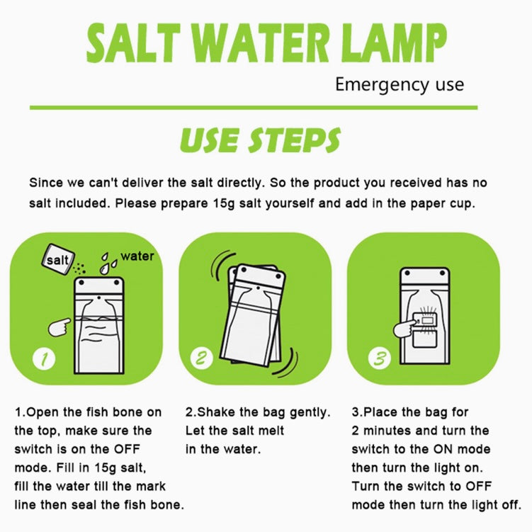VKOSHA Salt Water Lamp هو حل إضاءة فريد من نوعه يعتمد على الماء المالح للطاقة، مما يجعله خاليًا من التلوث وصديقًا للبيئة. هذا الضوء المضاد للطوارئ مثالي للأنشطة الخارجية مثل الصيد ليلاً والتخييم، حيث يمكنه العمل بشكل مستدام لمدة تصل إلى 140 ساعة. مع ثلاثة أضواء LED، يمكن للمصباح الليلي LED أن يصل إلى سطوع يصل إلى 50 شم