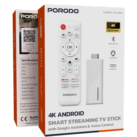 جهاز ذكي لتحويل أي تلفاز إلى شاشة ذكية بنظام اندرويد 14.0، دقة 4K، تحكم صوتي ومساعد Google، اتصال Wi-Fi مزدوج، بلوتوث 5.0 – أبيض من Porodo
