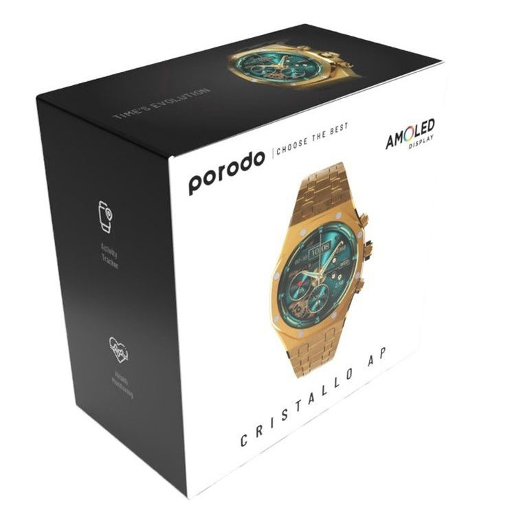 صُنعت حافة الساعة من سبائك الزنك المتينة، مما يمنحها ليس فقط أناقة ولكن أيضًا متانة طويلة الأمد. توفر دقة الشاشة Amoled بحجم 466 * 466 صورًا حادة وملونة، ومع 128 ميجابايت من ذاكرة التخزين الفلاشية، يمكنك تخزين بياناتك بسهولة. تتميز ساعة Porodo Cristallo AP Smart Watch ببطارية ليثيوم بوليمر بسعة 260 مللي أمبير، توفر وقت عمل مذهل يصل إلى 7-15 يومًا بشحنة واحدة تستغرق 2-3 ساعات.