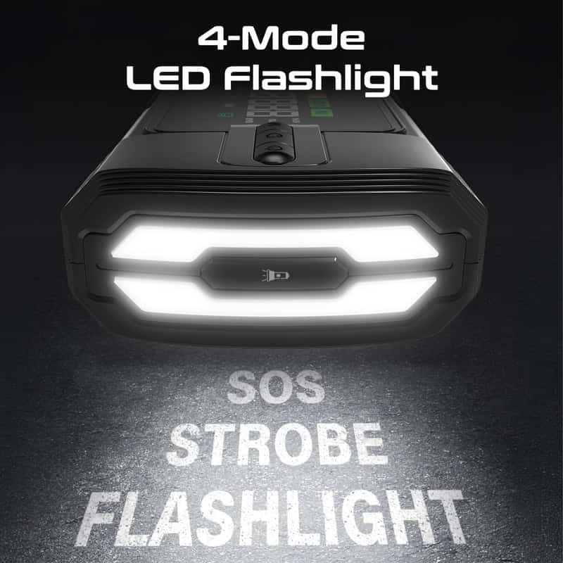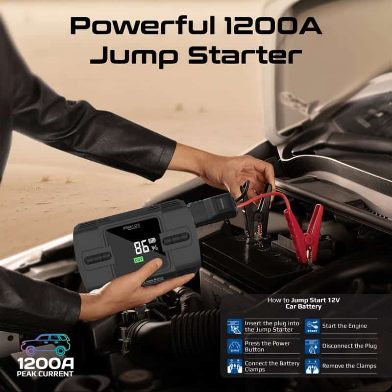 جهاز قفز السيارة عالي السعة بقدرة 1200 أمبير/12 فولت مع ضاغط هواء بقوة 150 بي إس آي وبنك طاقة بسعة 12000 مللي أمبير مع مصباح يدوي