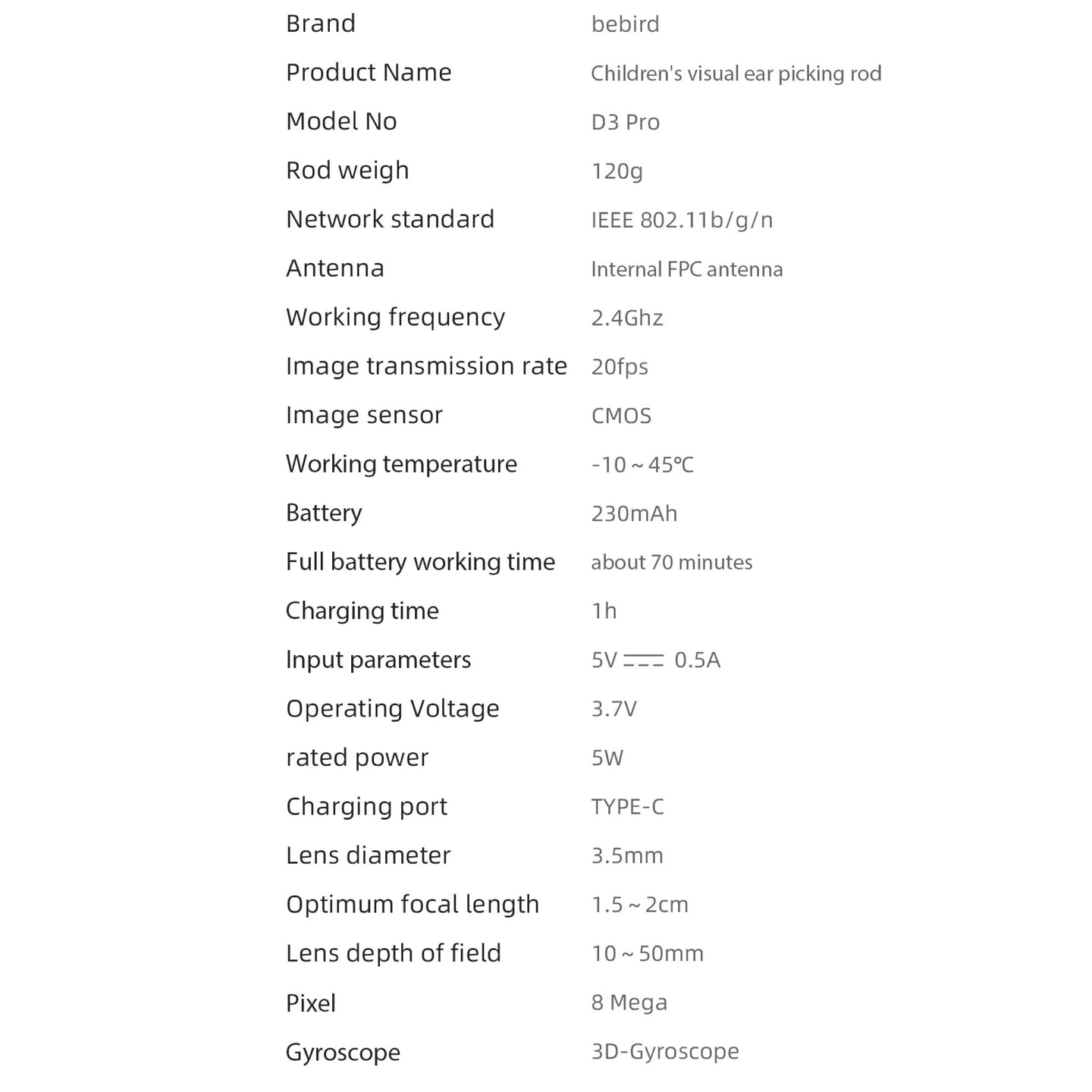 عصا تنظيف الأذن المرئية الذكية من شاومي Bebird D3 Pro تحتوي كاميرا صغيرة مرنة بقوة 800 واط لتنظيف الأذن. تم تصميمها خصيصًا لأغراض تنظيف الأذن، وبالأخص للأطفال. تتيح الكاميرا بقوة 800 واط الوصول المرئي إلى قناة الأذن، مما يسمح للمستخدمين بفحص وتنظيف الأذن بفعالية. من المهم اتباع التعليمات والإرشادات المقدمة من الشركة المصنعة لضمان الاستخدام الآمن والسليم.