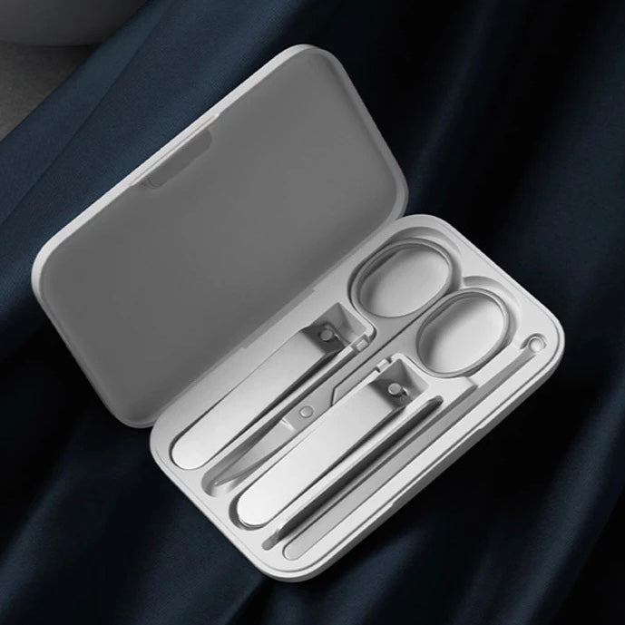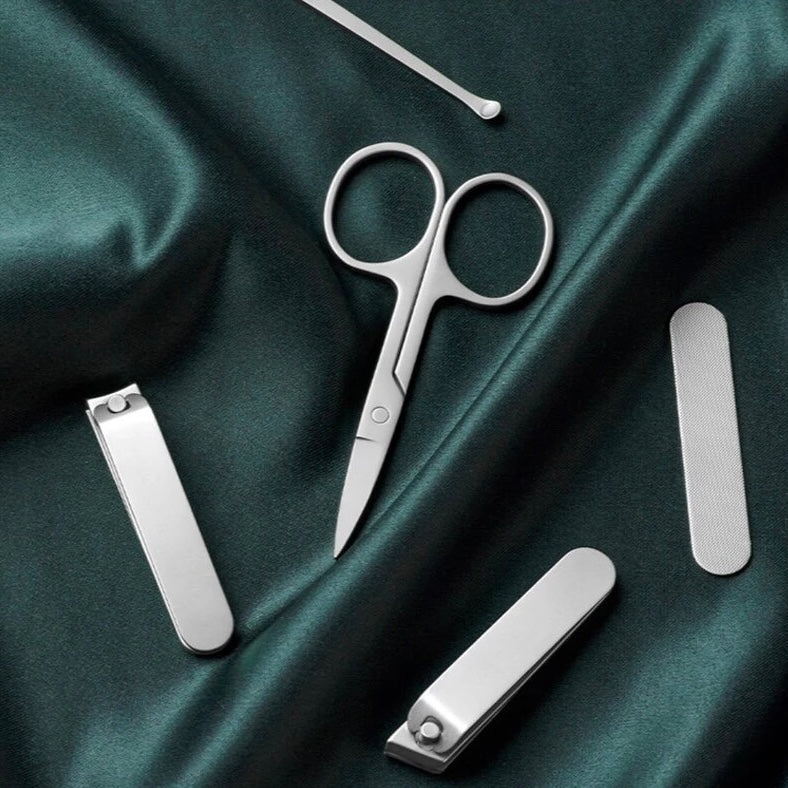 - مجموعة بسيطة من خمس قطع: قصافة أظافر عادية، قصافة أظافر مائلة (كماشة الزوائد اللحمية)، مبرد الأظافر، مقص تجميل، ملعقة للأذن