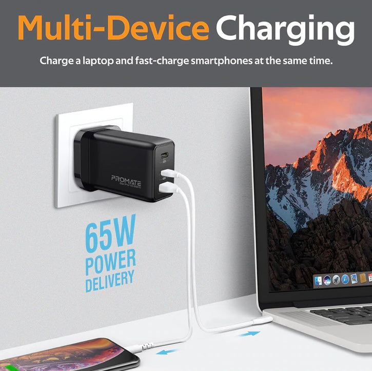 65W GaN Wall charger with Dual 65W USB-C Ports and 30W USB-A Port • Fast Charging Power Delivery for iPhone 8 and up • Quick Charge for All Androids