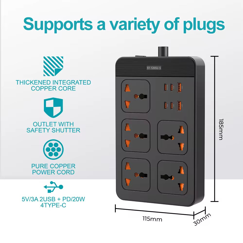 WINNING STAR ST-1205U-5 Multi-Power Socket – 5 Sockets + 6 USB Charging Ports (2 USB + 4 Type-C) – Fast Charger with 5m Cable