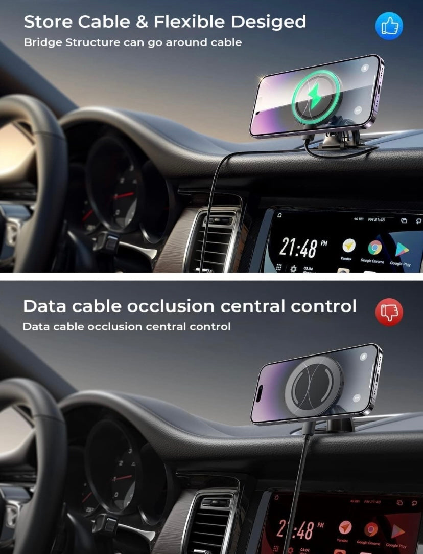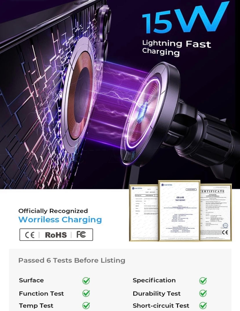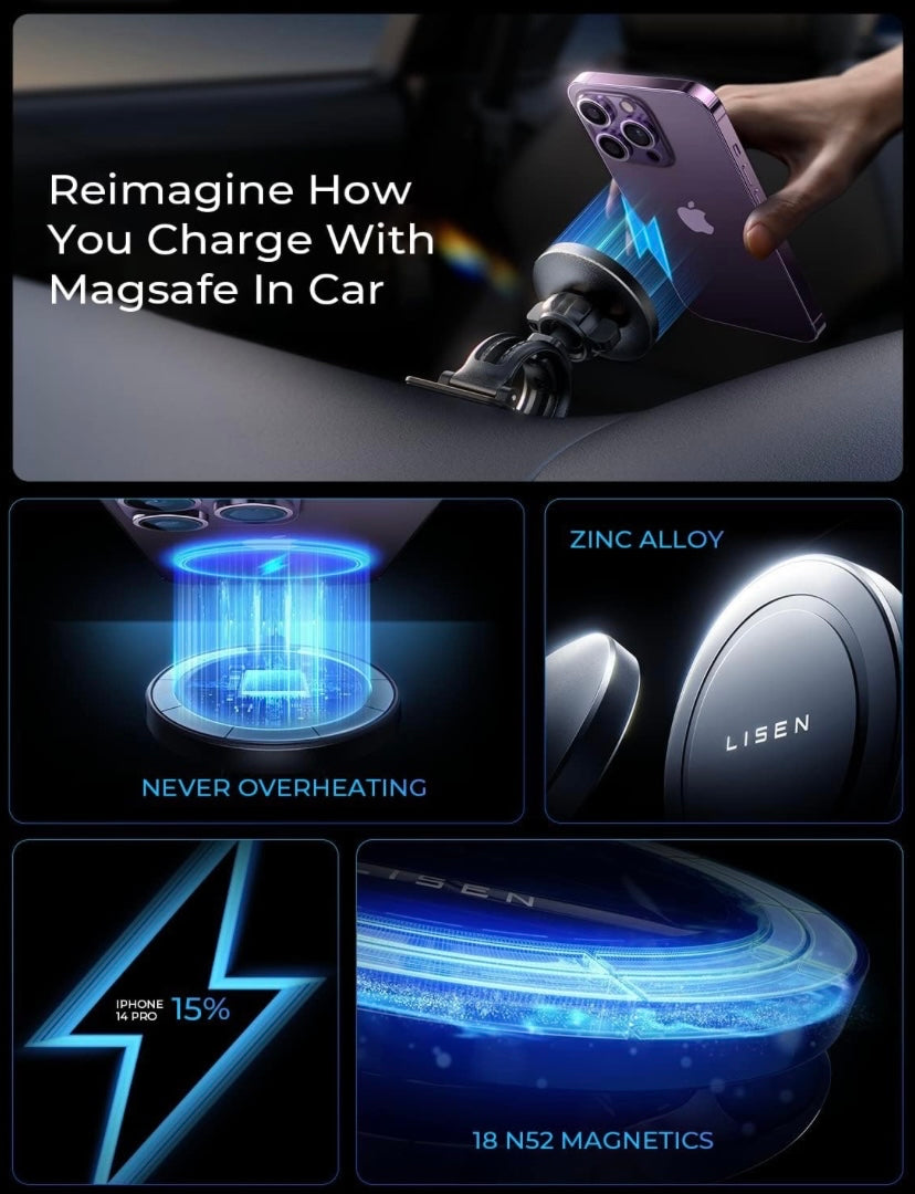 - MagSafe Technology Holder to Protect iPhone Battery: Equipped with advanced MagSafe technology to prevent fire and prevent warming, LISEN wireless car phone holder supports fast charging of up to 15W. You don't have to worry about your phone running out of battery quickly while on the go, your phone will stay charged at all times.