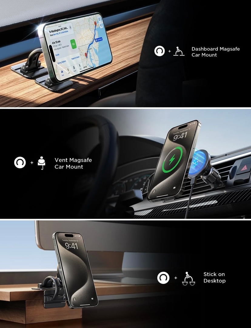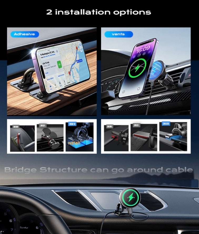 - FOUR FUNCTION SECURE MOUNTING: G23F one-level adjustable adhesive base design allows the wireless car phone holder for iPhone to stick firmly on the dashboard. It stays put even on bumpy roads, ensuring your phone's stability. In addition, the Magsafe car charger holder can be installed on your car's air vents easily, providing you with a range of mounting options to meet various scenarios.