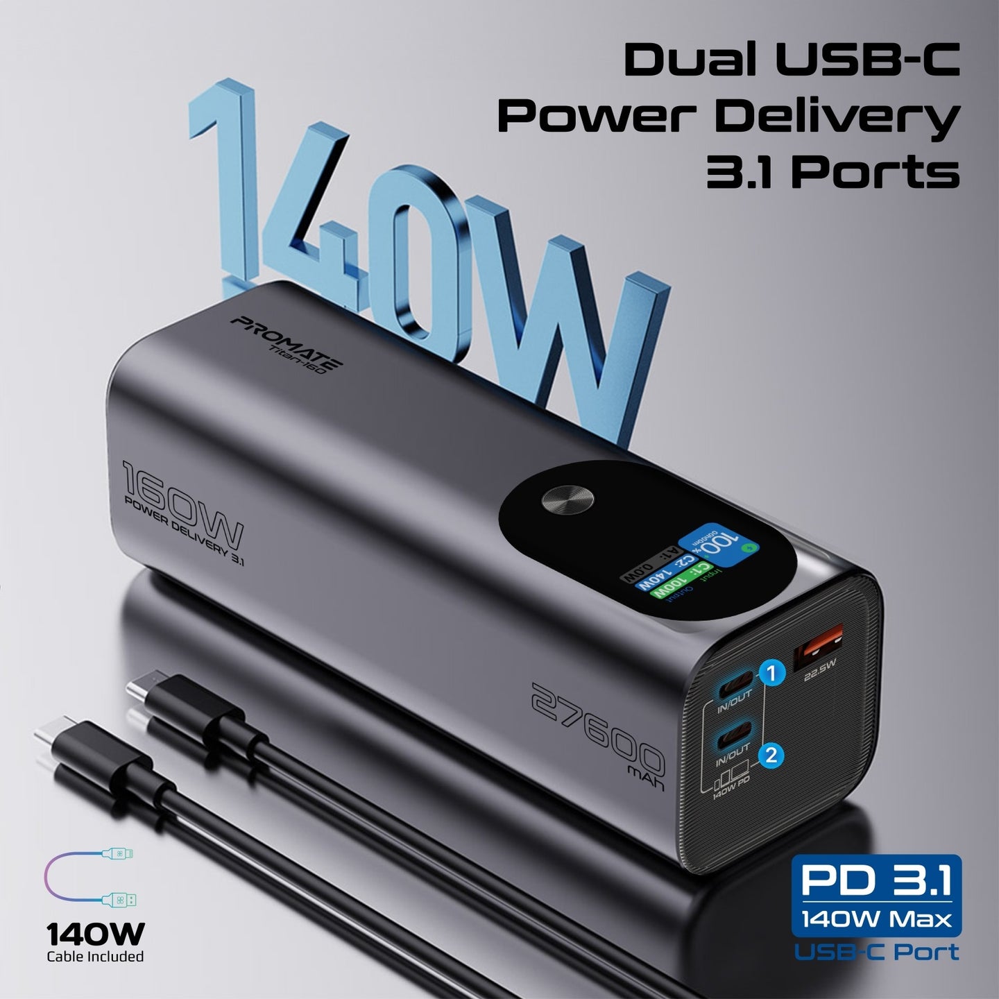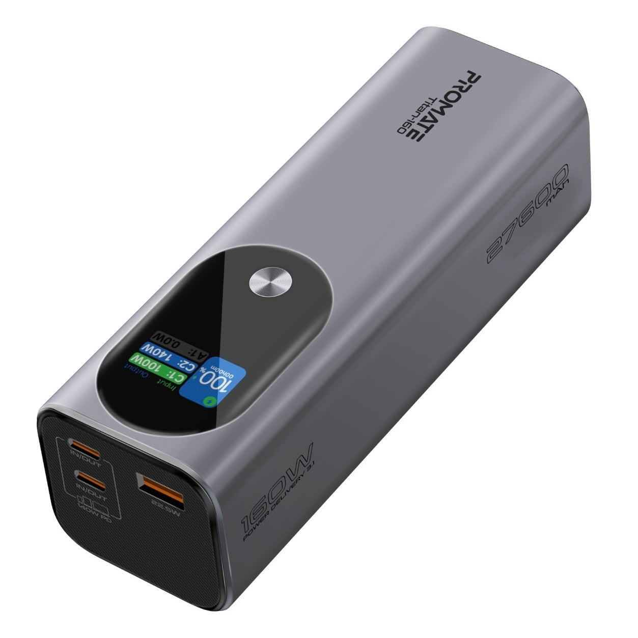 Promate Power Bank 160W 27,000mAh Portable Charger for Laptop 3 PD 3.1 Ports with Smart Digital Display, Compatible with iPhone 15 14/13 Series, Samsung, MacBook, Dell and More.