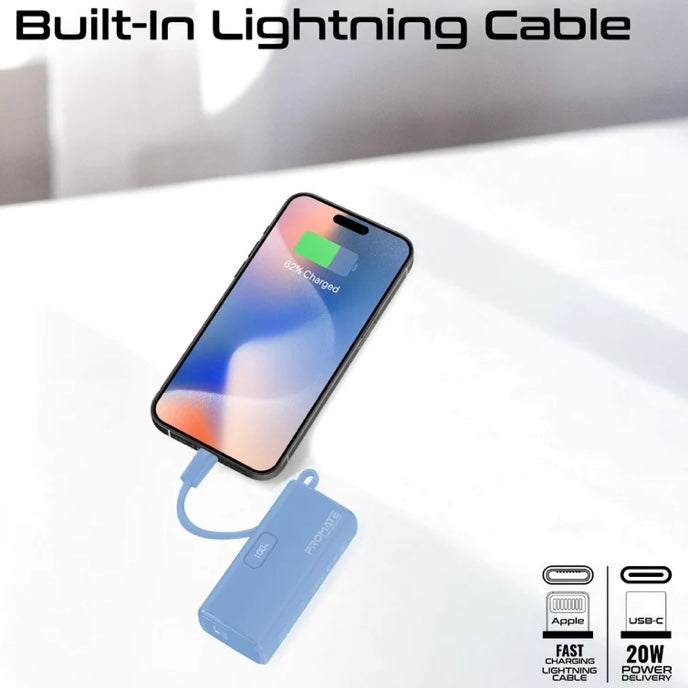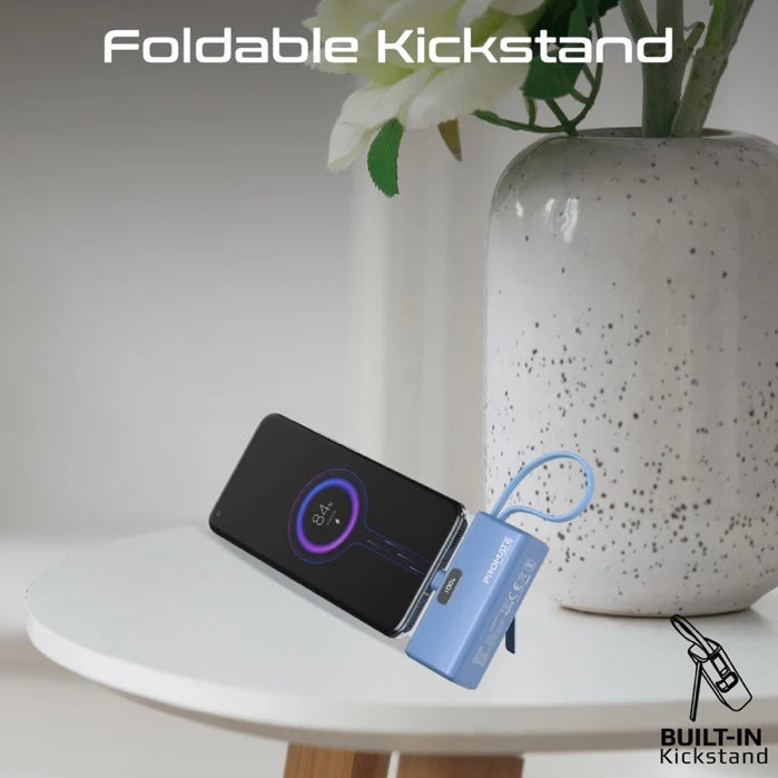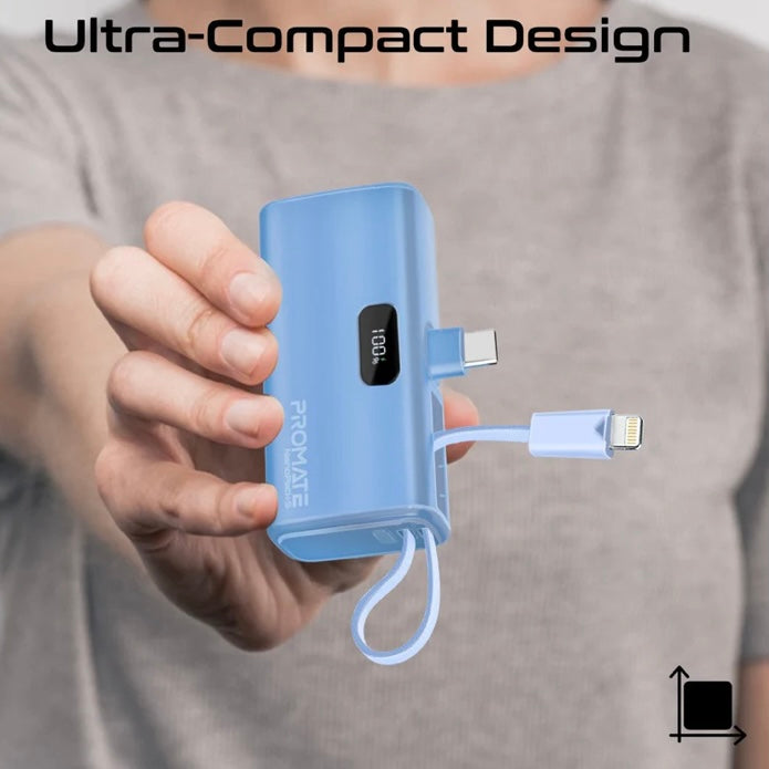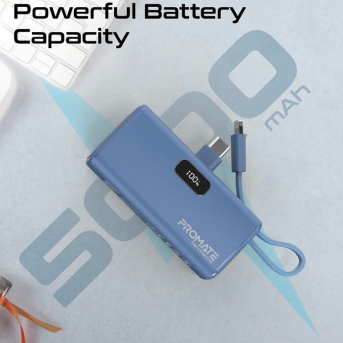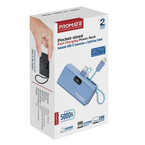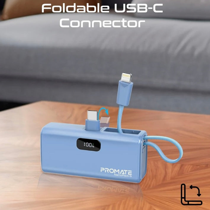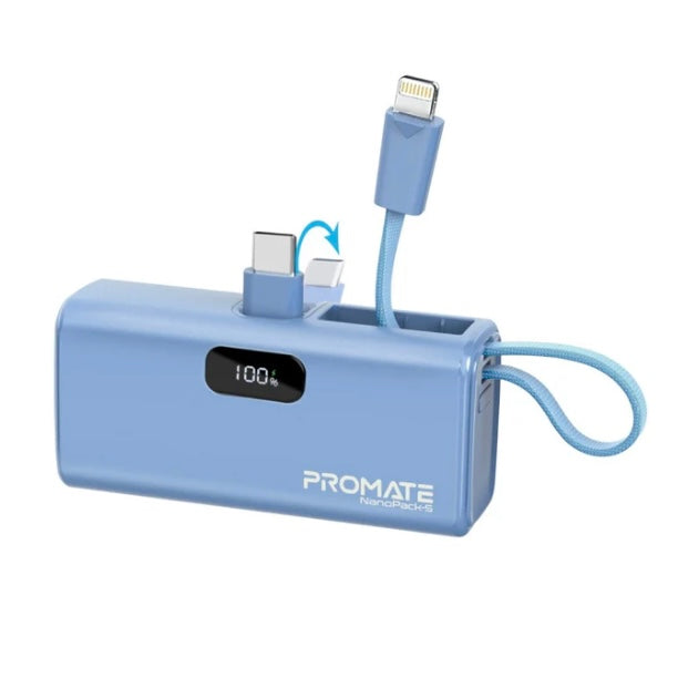 Enjoy unrestricted power and convenience with NanoPack-5, the perfect portable charging partner. Featuring a powerful 5000mAh lithium-ion battery, the NanoPack-5 ensures that your devices are always charged. Say goodbye to cable clutter with the built-in 18W Fast Charging Lightning cable, while the 20W USB-C charging port ensures fast charging for your devices. The foldable 20W USB-C charging connector simplifies charging further. Safety is paramount with the multi-protection system, which protects against overcharging and high voltage problems. Stay informed with the smart LED display and the NanoPack-5's ultra-compact design with foldable stand makes it the perfect travel partner.