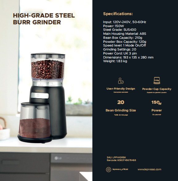 Large Capacity: It has a large capacity of up to 210 grams of coffee beans, allowing you to grind large amounts in one go.
