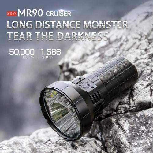 The IMALENT MR90 flashlight is a high-performance rechargeable searching flashlight that combines spot- and floodlight. The utilizes 8 pieces of American CREE XHP70 2nd LEDs and 1 piece of American LUMINUS SBT 90 2nd LEDs, with a maximum output of 50,000 lumens and longest range of up to 1586 meters.