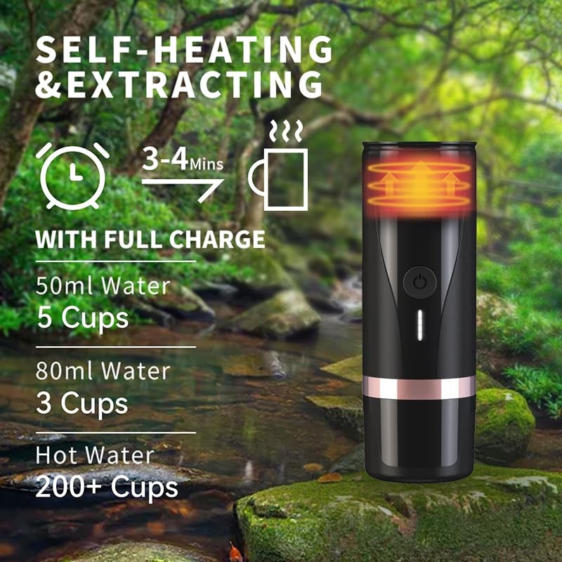 • Rechargeable Battery: With built-in 7500mAh battery, it can heat and extract 4-5 cups of hot espresso using cold water (50ml/cup) or 3 cups of espresso using 80ml full water, or more than 200 cups if hot water is added for preparation. Before first use, please fully charge this small device using the 10W/15W adapter. It takes 3-3.5 hours to fully charge under this power adapter.