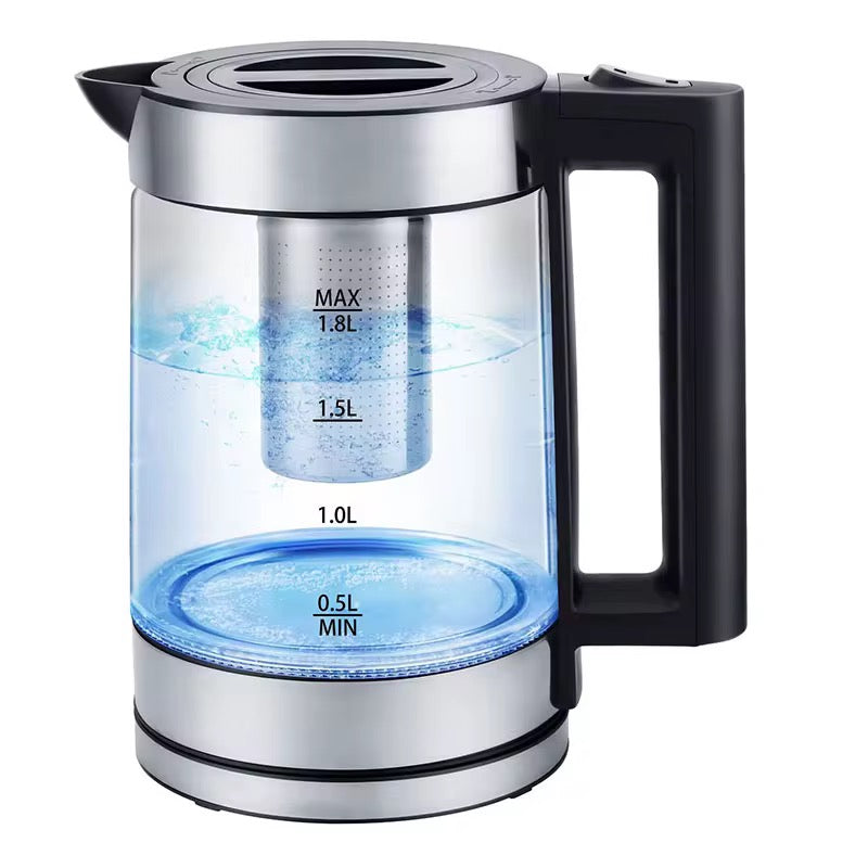 Electric kettle made of glass and stainless steel, with fast heating capacity and a transparent design that allows you to see the water level. It features a blue LED light to indicate when it is in operation, and has a capacity of 1.8 liters , with clear water level markings. The handle is comfortable to use and is thermally insulated, making it ideal for boiling water safely and efficiently