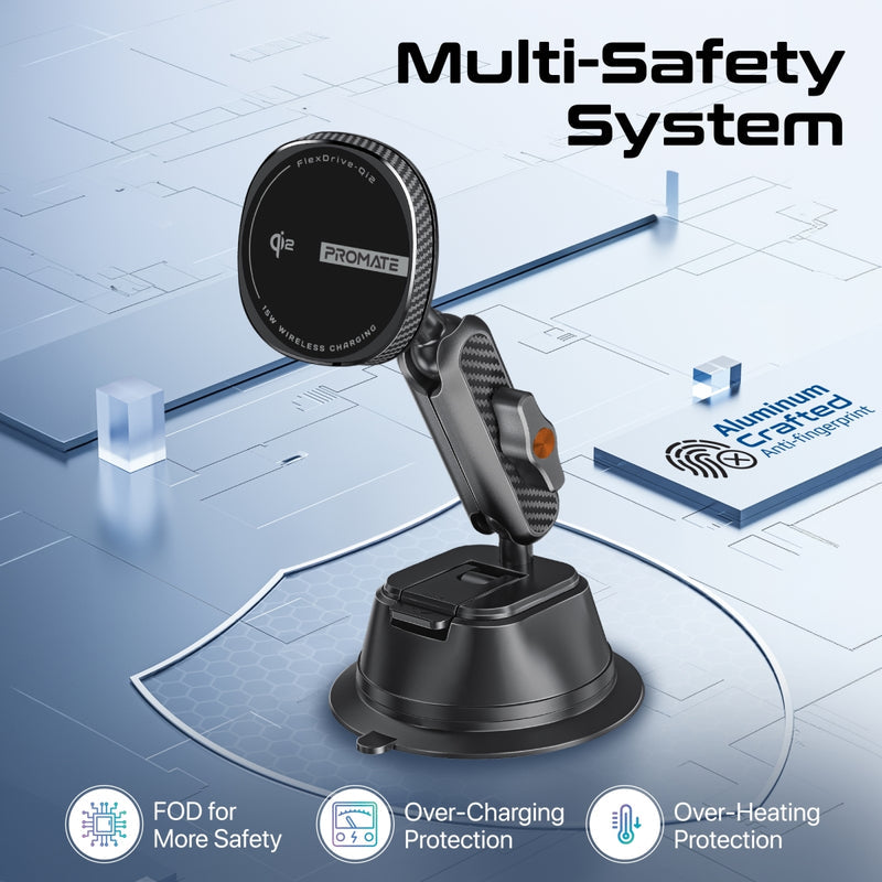 Elevate your driving experience with Promate 's FlexDrive-Qi2 , a state-of-the-art wireless charger designed to deliver exceptional performance. Featuring the latest FlexiGrip™ Qi2 technology , this charger delivers up to 15W of wireless charging power and is MagSafe compatible , meeting the needs of your smart devices with maximum speed and efficiency.