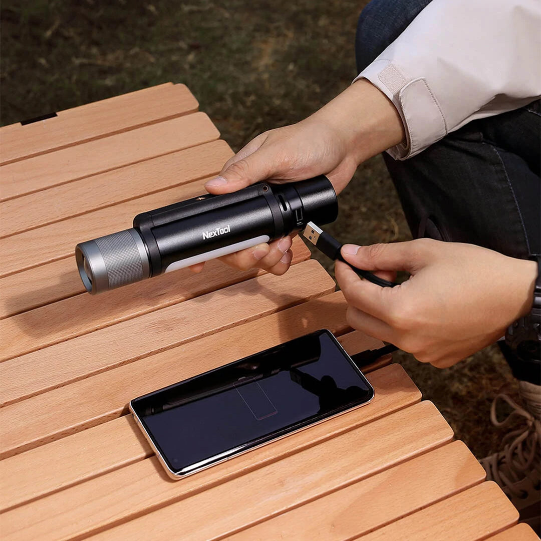 The Nextool Thunder Music Flashlight combines powerful lighting and smart technologies in one versatile design. With up to 900 lumens of brightness and a four-color main light, it provides powerful and flexible illumination for all adventures. Its standout feature is the built-in Bluetooth speaker, which transforms your flashlight into a portable entertainment tool, with side lights that play to the beat of your music. Thanks to the built-in 1400mAh battery, it can also be used as a power bank to charge your devices on the go. Its IPX4 water-resistant design makes it ideal for camping, hiking, and everyday use.