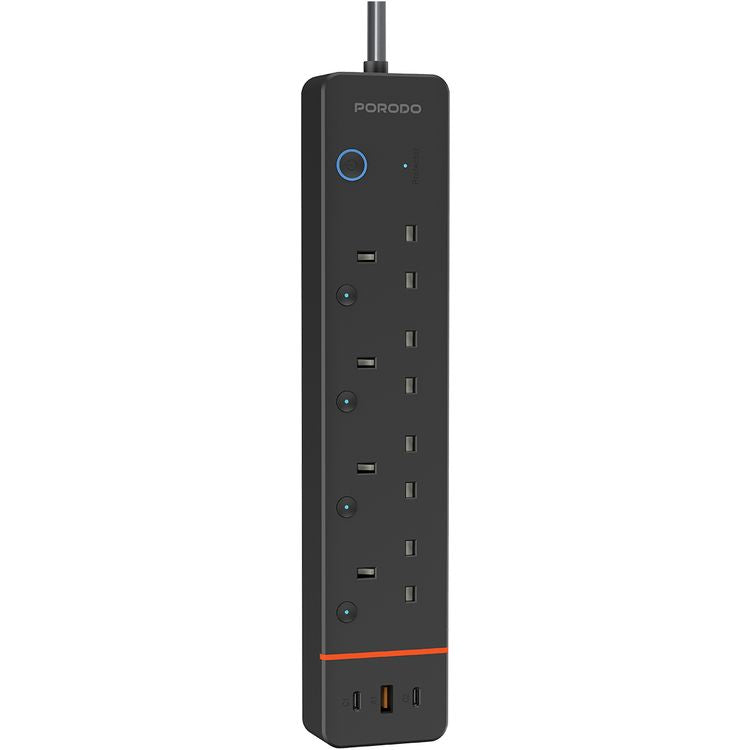 Get the Porodo ChargeLink Smart Power Strip to manage your devices efficiently and easily with intelligent power control. The strip features four AC outlets and three USB ports , including USB-A and USB-C, to provide flexible, multi-charging for all your electronic devices. The USB-A port supports 15W charging, while the USB-C provides 12W fast charging.