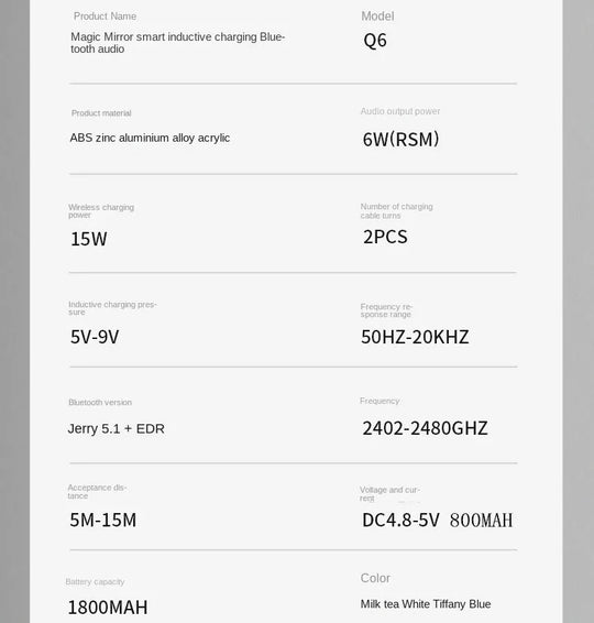 This smart magic mirror comes with wireless bluetooth audio, weighs 0.345 lbs and has audio output power of 6W and wireless charging capacity of 15W. It has a 1800mAh battery and supports TF card in MP3...Regular price AED 125.00 -