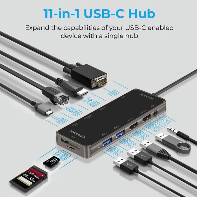 11-in-1 USB-C adapter with 100W Power Delivery • 4K HDMI port • 1080p VGA port • Dual display support • 1000Mbps LAN • USB 3.0 and USB 2.0 ports • AUX audio input • Card slot SD/TF
