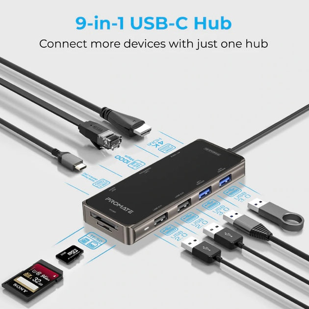 PROMATE PrimeHub-Go 9 in 1 Compact Multiport USB-C Hub with 100W Power Delivery