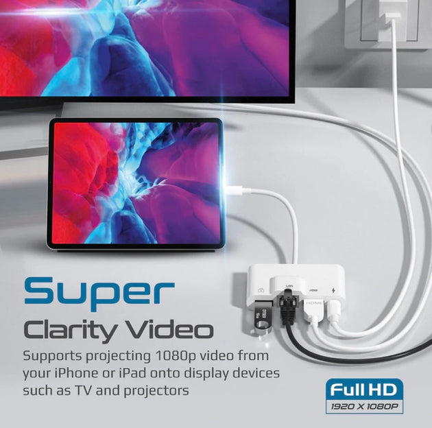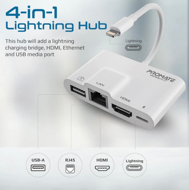 A 4-in-1 hub to charge your phone and use additional inputs (HDMI, USB, LAN) at the same time from PROMATE