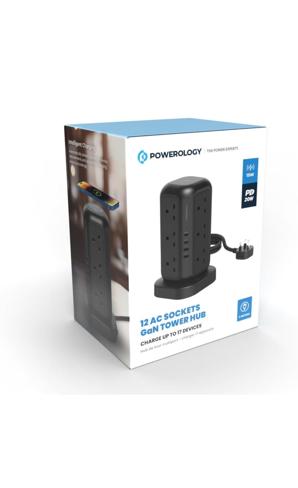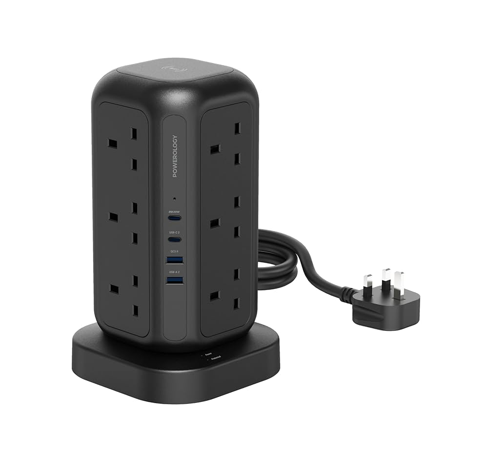 Elevate your charging and power management with the Powerology PowerTower Pro , the ideal solution for safely and efficiently connecting and powering your devices. It features a high power output of up to 3250W , 12 UK-based outlets to power multiple devices simultaneously, a 15W fast wireless charger , and advanced charging technologies via 20W USB-C PD and 18W USB-A QC ports .
