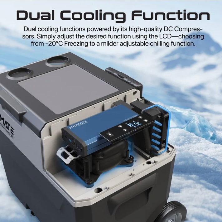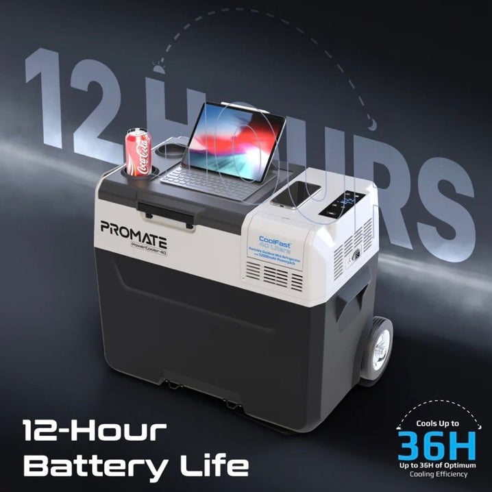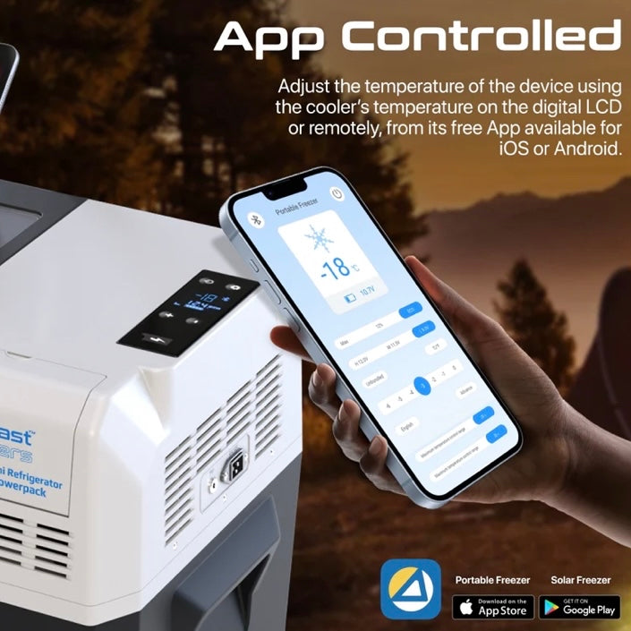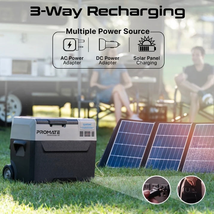 Power Cooler-40 is the perfect solution for your outdoor trips, camping and long outdoor events. Coming with the latest technology, this device is equipped with a removable 52,000mAh power pack that also acts as a portable power bank, allowing you to charge your devices on the go. With a capacity of up to 40 liters, the Power Cooler-40 is ideal for long road trips, camping, and other outdoor events. The built-in inverter compressor allows the fridge to have double cooling function as a fridge or freezer without the hassle of defrosting for up to 12 hours. The PowerColor-40 can be charged in three convenient ways: using an AC outlet, a 12V DC outlet, or using solar panels. Don't let a lack of cooling limit your exploration with this advanced and versatile outdoor portable refrigerator.