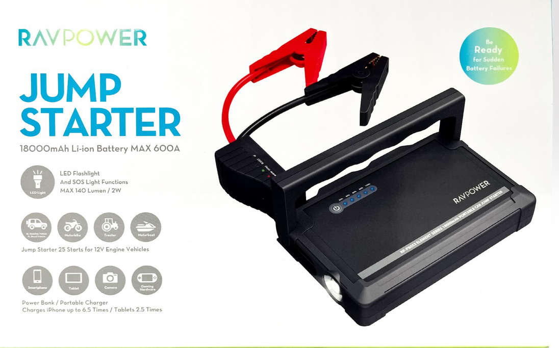 RavPower car jump starter with a lithium-ion battery of up to 600 watts and a capacity of 18,000 mAh