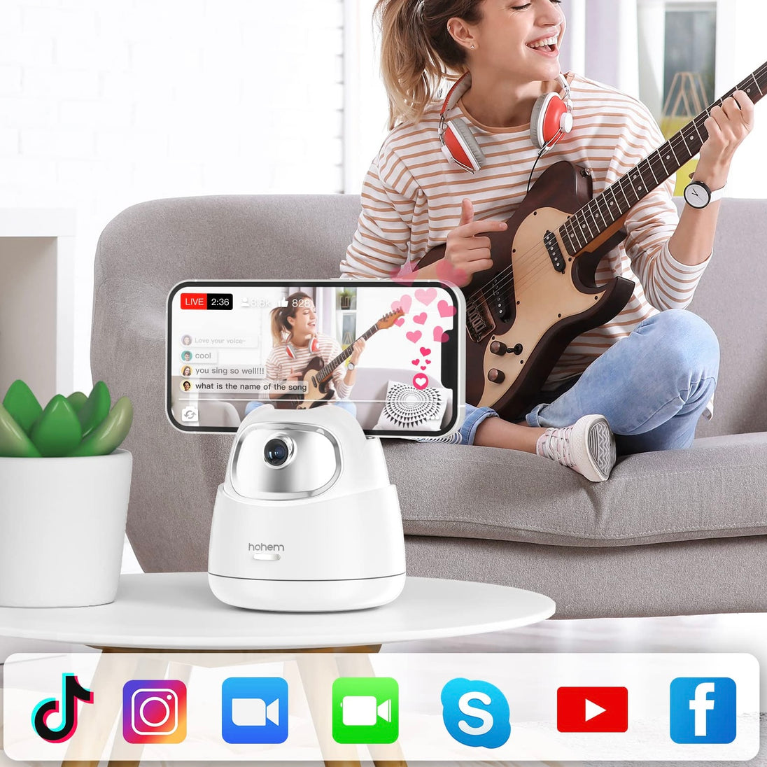 This 360 degree rotating phone holder is easy to mount and start, which is compatible with all video and chatting apps. You don't need to download any apps or connect the Bluetooth before use. Just press the button and clip your phone, the phone tracking holder will follow after detecting your OK gesture.