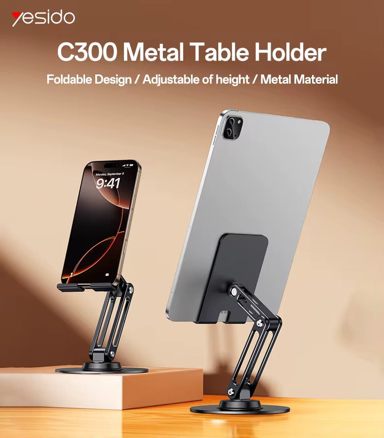 Experience the convenience of using your phone with the YESIDO C300 , a durable aluminum alloy desk stand equipped with a 360° rotating base and adjustable height to suit all your needs.